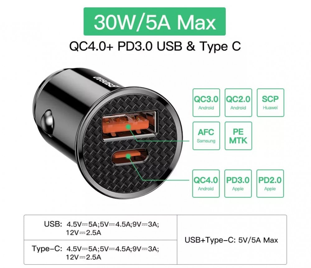 شاحن جوال للسيارة من شركة Baseus30 واط يدعم الشحن السريعمتوافق مع العديد من أنظمة الشحنمتوفر بنوعين من المنافذ