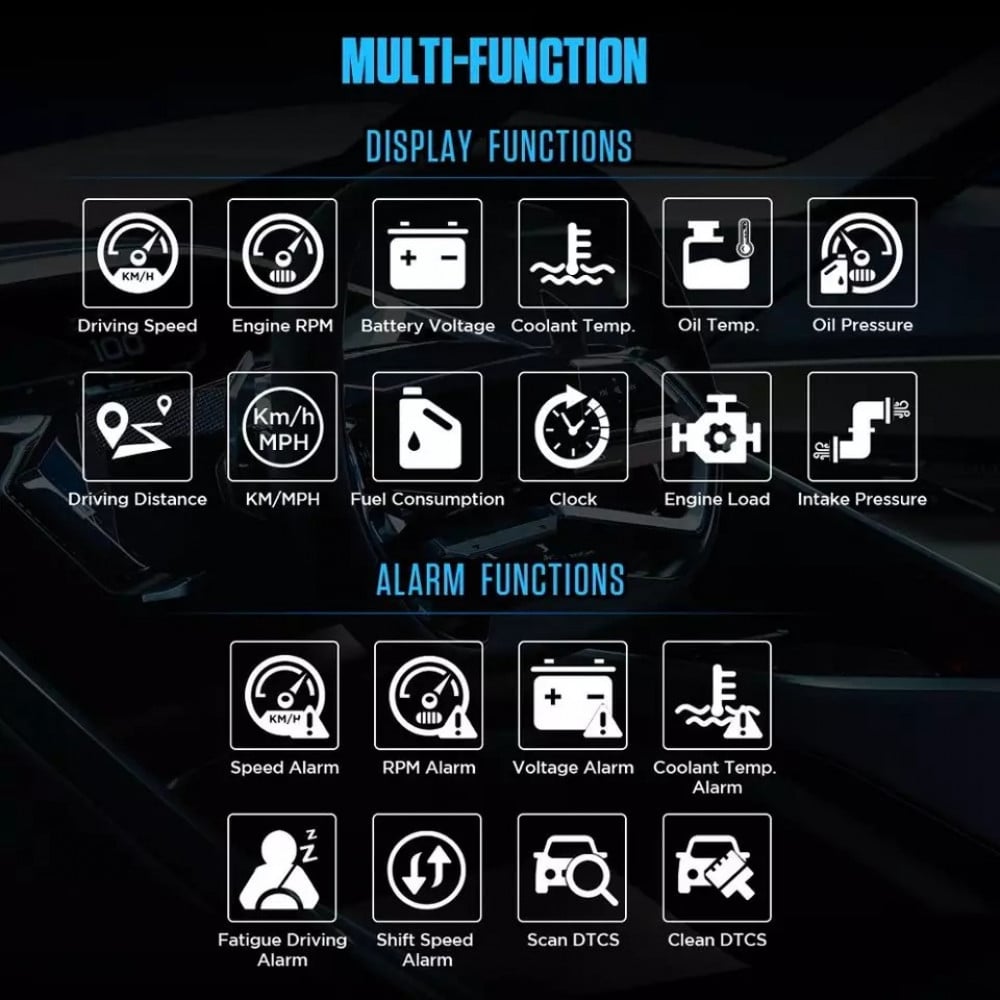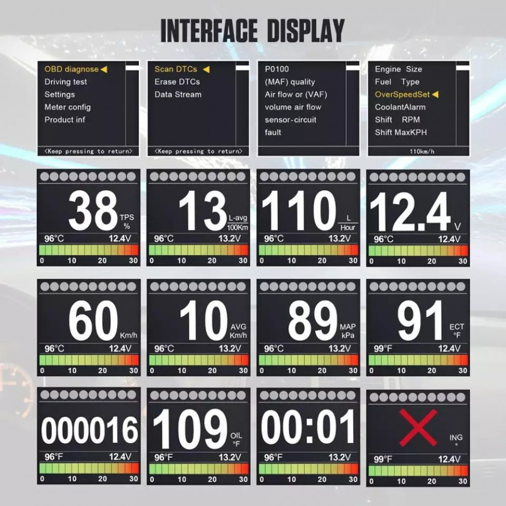 يعرض عدة قراءات من خلال منفذ الـ OBD للكثير من السيارات (بعض القراءات لا تعمل على بعض السيارات)